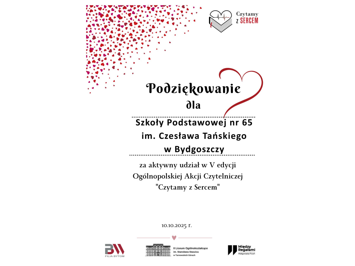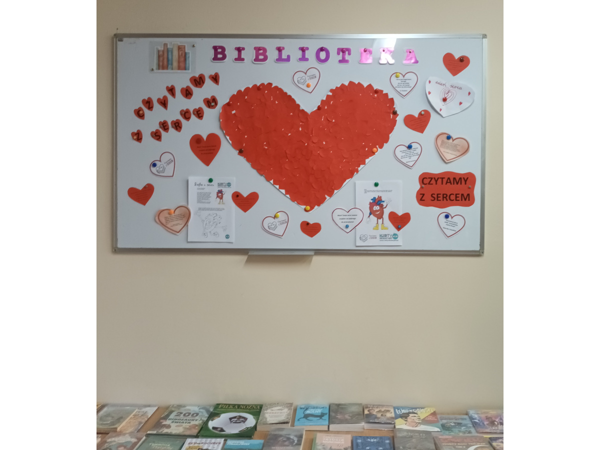 Po raz kolejny biblioteka szkolna wzięła udział w Ogólnopolskiej Akcji Czytelniczej  "Czytamy z Sercem".  Projekt zwraca uwagę na dwa święta obchodzone 29 września - Ogólnopolskiego Dnia Głośnego Czytania oraz Światowego Dnia Serca. Celem akcji jest promocja literatury i czytelnictwa oraz  poszerzanie wiedzy na temat funkcjonowania i chorób serca. Rozwija ona wrażliwość na cierpienie i potrzeby osób chorych. Propaguje także zdrowy styl życia jako jedną z form przeciwdziałania chorobom układu sercowo-naczyniowego.