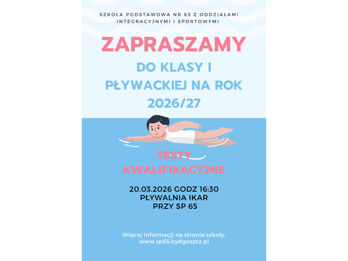 Próba sprawnościowa odbędzie się 20.03.2026 o godzinie 16.30 na sali gimnastycznej SP 65, a następnie na pływalni IKAR przy SP 65 w Bydgoszczy. Dzieci tego dnia muszą mieć strój i obuwie sportowe oraz strój na basen, klapki i czepek. Zbiórka o 16:30 na pływalni Ikar – rodzice również muszą posiadać klapki basenowe.