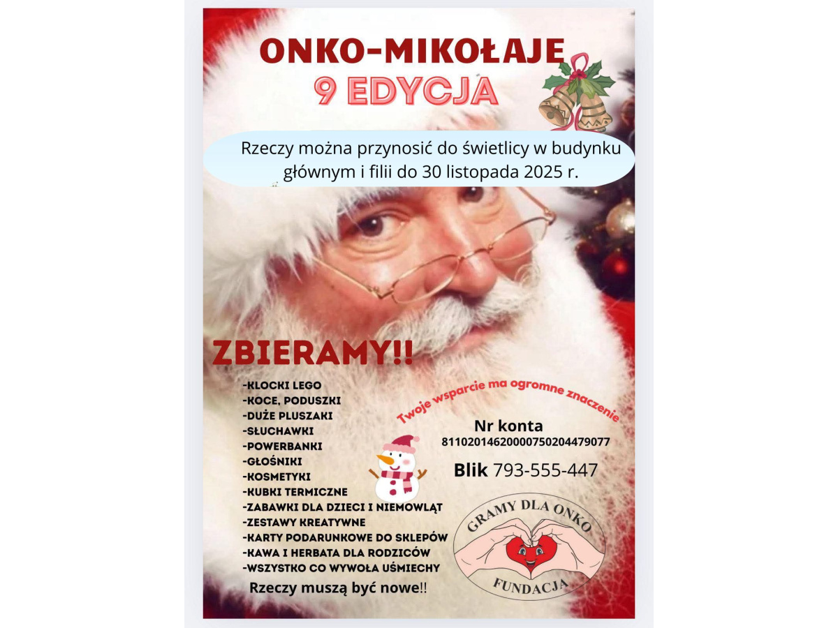 Razem z Fundacją GRAMY DLA ONKO zapraszamy do udziału w 9 edycji akcji ONKO-MIKOŁAJE. Tym razem zbieramy rzeczy, które zostaną podarowane chorym onkologicznie dzieciom i ich rodzicom. Wymienione na plakacie Fundacji przedmioty można przynosić do świetlicy w budynku głównym i filii do 30 listopada.
